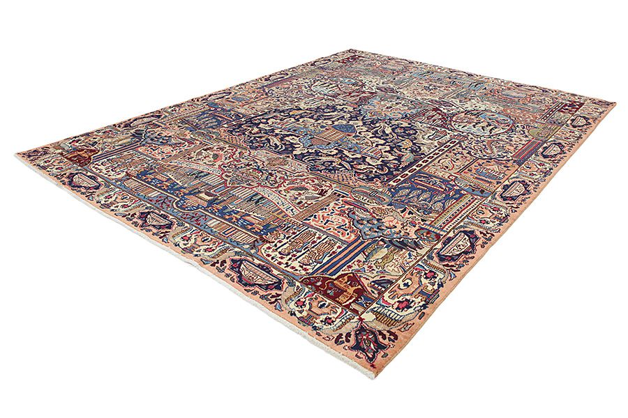 Tapis Kashmar: La ville Kasmar se trouve à la région Khorasan au sud ouest de la ville Mashad en Iran d’est. Elle a une très grande histoire et son ancien nom est Torshiz. Ici des tapis excellents d’une qualité très élevée sont tissés pendant des siècles. Les tapis sont tissés de façon épaisse avec une laine douce fine à des belles couleurs du bleu ciel par opposition du crème et du beige d’ivoire. Ils utilisent du vert clair, du rouge et du marron aux tapis modernes. Les caractéristiques des tapis Kashmar sont les grandes tailles et les dessins uniques qui sont comme des tableaux de peinture avec des arbres, des fleurs et des coupoles du minaret. Aussi ils ont des répresentations des évenements historiques importants de l’histoire de Perse ou d’un homme historique connu ou de l’histoire d’un roi persan très respecté. À Kashmar ils tissent des chefs d’œuvres élégants avec de l’harmonie de couleurs, de la complexité des dessins avec des détails pour montrer l’amour des Perses pour la beauté et l’art. Les tapis Kashmar sont résistants et en vieillisant ils deviennent de plus en plus beaux.