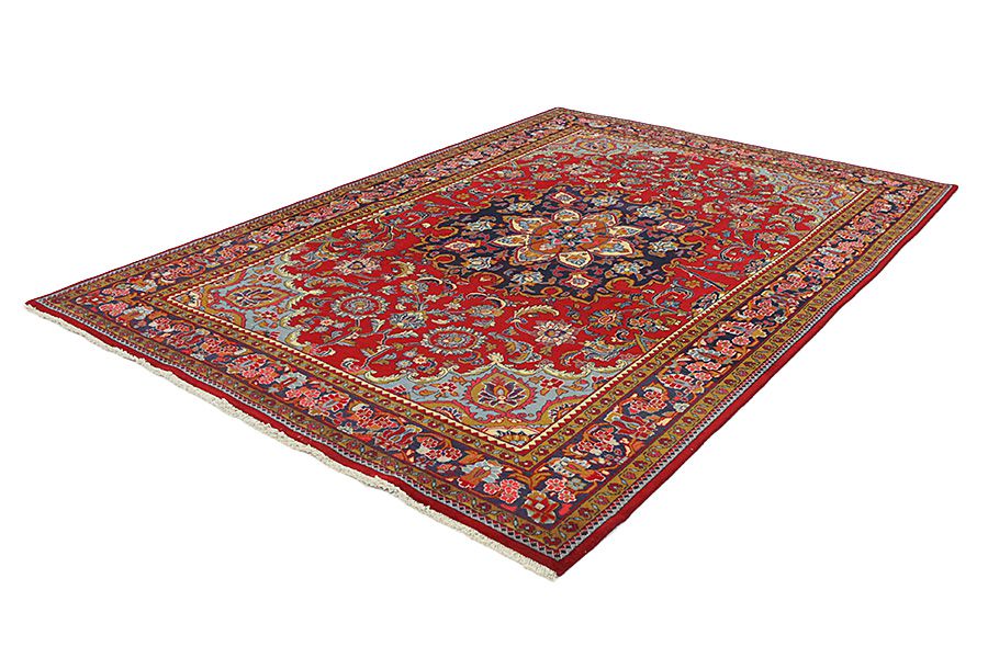 Tapis Tabriz: La ville Tabriz est la capitale de la province Azerbaïjan au sud-ouest d’Iran. Jusqu’à la fin de l’époque des caravanes Tabriz était le centre le plus important du commerce et du tissage des tapis. Par ici l’Ouest s’approvisionnait les chefs d’œuvres que des tisseurs renommés et capables tissent. Leurs qualités élevées ont fait les tapis connus aux marchés internationaux. Des atéliers des tapis noués à la main ont été crées où ils tissent de vieux et de nouveaux dessins avec une très grande densité en nœuds avec des matériaux de qualité excellente. La soie et la laine qualintative fine font les tapis de première classe. C’est la seule ville de Perse qui produit un si grand volume et et une si grande variété des tapis. Les tapis Tabriz sont impossants et ils ont leur style et leur originalité avec ou sans médaillon, avec des dessins pleins de l’imagination et de l’unicité des fleurs, des répresentations, des strophes, des poèmes à des couleurs comme le beige, le bleu et le rouge