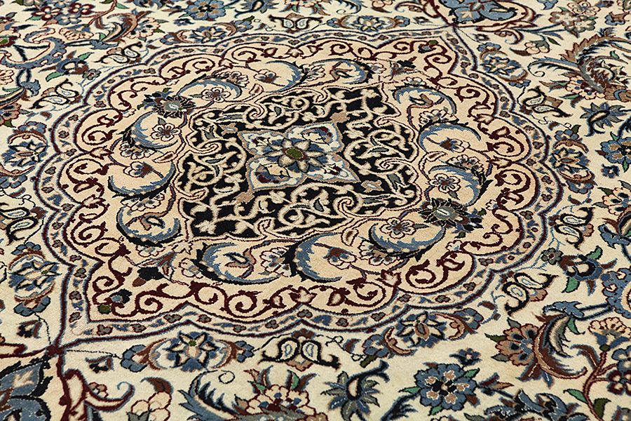 Tapis Nain: Les tapis Nain sont également tissés dans les régions voisines et non exclusivement dans la même région. Sur les tapis Nain est utilisé le célèbre dessin de Shaba Abas. De plus, les tapis utilisent généralement du coton sur la chaîne. La chaîne est composée d'un nombre particulier de fils, appelés "La". Les tapis Nain 9La sont des tissus très minces et comportent de quatre fils (9La). Aujourd'hui, dans la ville de Nain, ils produisent une qualité 9La très élégante.