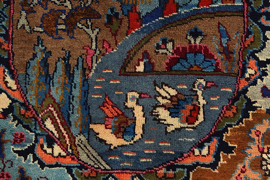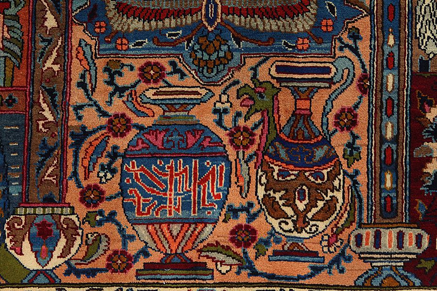 Tapis Kashmar: La ville Kasmar se trouve à la région Khorasan au sud ouest de la ville Mashad en Iran d’est. Elle a une très grande histoire et son ancien nom est Torshiz. Ici des tapis excellents d’une qualité très élevée sont tissés pendant des siècles. Les tapis sont tissés de façon épaisse avec une laine douce fine à des belles couleurs du bleu ciel par opposition du crème et du beige d’ivoire. Ils utilisent du vert clair, du rouge et du marron aux tapis modernes. Les caractéristiques des tapis Kashmar sont les grandes tailles et les dessins uniques qui sont comme des tableaux de peinture avec des arbres, des fleurs et des coupoles du minaret. Aussi ils ont des répresentations des évenements historiques importants de l’histoire de Perse ou d’un homme historique connu ou de l’histoire d’un roi persan très respecté. À Kashmar ils tissent des chefs d’œuvres élégants avec de l’harmonie de couleurs, de la complexité des dessins avec des détails pour montrer l’amour des Perses pour la beauté et l’art. Les tapis Kashmar sont résistants et en vieillisant ils deviennent de plus en plus beaux.