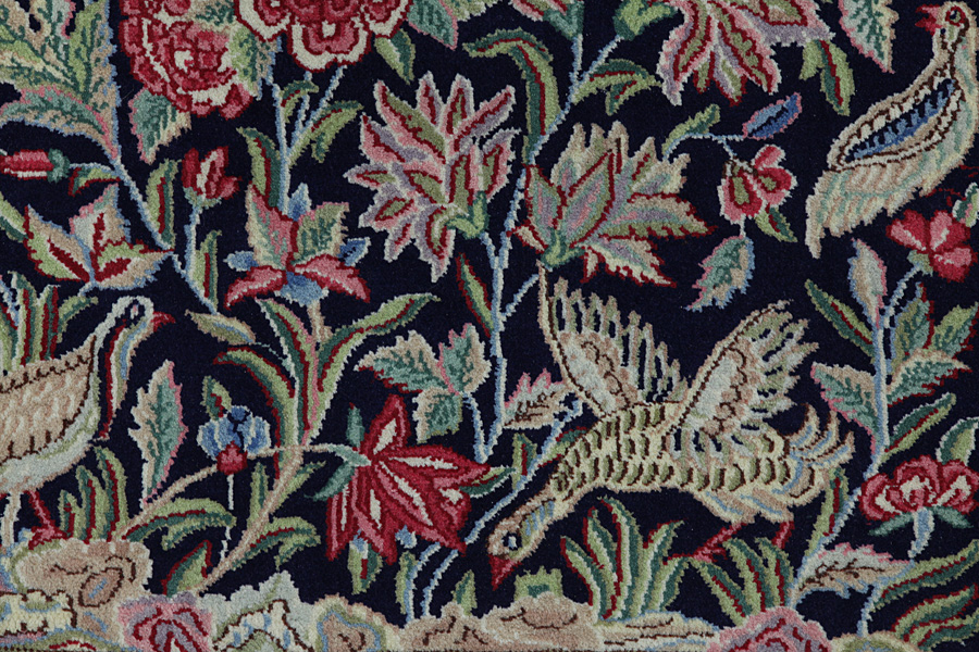 Tapis Kirman: Le tissage des tapis qui est une vieille tradition à Kerman est une de principales industries de la ville. Les tapis qui sont produits à la ville sont connus dans tout le monde. Le plus vieux tapis qui est trouvé à Kerman date avant 500 années, évenement qui prouve la superiorité des tapis qui sont tissus ici. Aussi des écharpes et des tissus fins et d’autres produits textiles de laine ou de coton sont fabriqués comme au passé. Quand en 1271 Marko Polo a visité la ville Kerman, elle est devenue un centre commercial et a lié le golf Persique avec Khorasan et l’Asie centrale. Pendant la dynastie de Sarafides, des tapis sont exportés en Angleterre et en Allemagne. Le succès des tapis Kerman est dû à l’événement que les tisseurs ont crée des dessins plus riches en ayant comme modèle, les tapis –aubusson. Leurs caractèristiques sont les couleurs brillantes et la multitude des fleurs avec des guirlantes et des médaillons. Les laines à la région Kerman sont des laines de grande qualité en graisse qui les font très brillants.