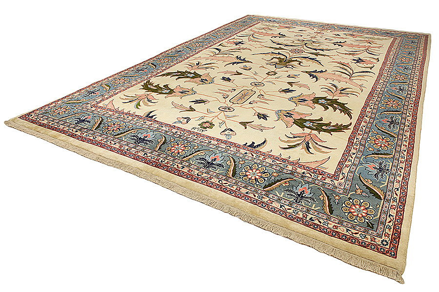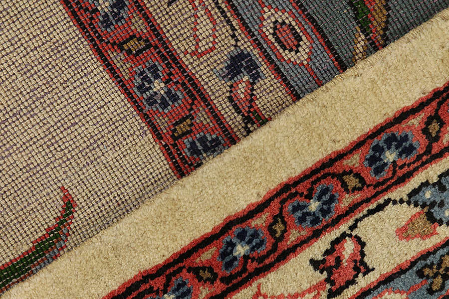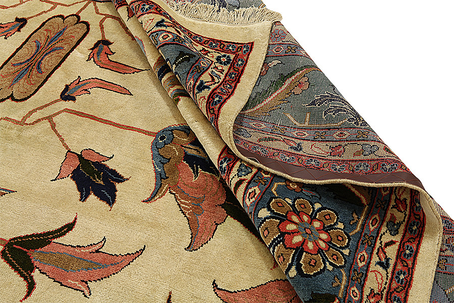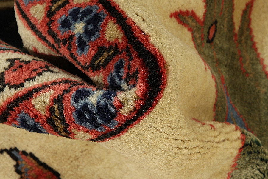 Tapis Sultanabad: À la province Farahan se trouve la ville Arak qui a 5.000 habitants, qui était connue comme Sultanabad. Cette ville est bâtie sur les ruines d’une petite ville qui s’appellait Daskerah. Aujourd’hui la ville Arak dont son nom signifie la bonne terre est une ville qui a des sols fertiles. Dans la ville Arak il y a la citadelle Soltan Abad dont la muraille a 7 métres d’épaisseur. Les tapis qui sont tissés dans la ville et dans les villages autour de la ville sont similaires aux tapis Sarouk mais la qualité, les dessins et les couleurs sont destinés surtout pour le marché d’ Amérique. Les tapis Arak sont solides grâce à leur tissage très serré et parce qu’ils sont tissés avec une double trame. Leur laine a une très bonne qualité. Les couleurs qu’ils utilisent sont le rouge, le rose, le beige et comme base le bleu foncé. Leurs dessins sont surtout des médaillons avec de surface unicolore tout autour. Aussi ils tissent des dessins riches, serrés, délicats avec des fleurs courbes comme les tapis Kerman