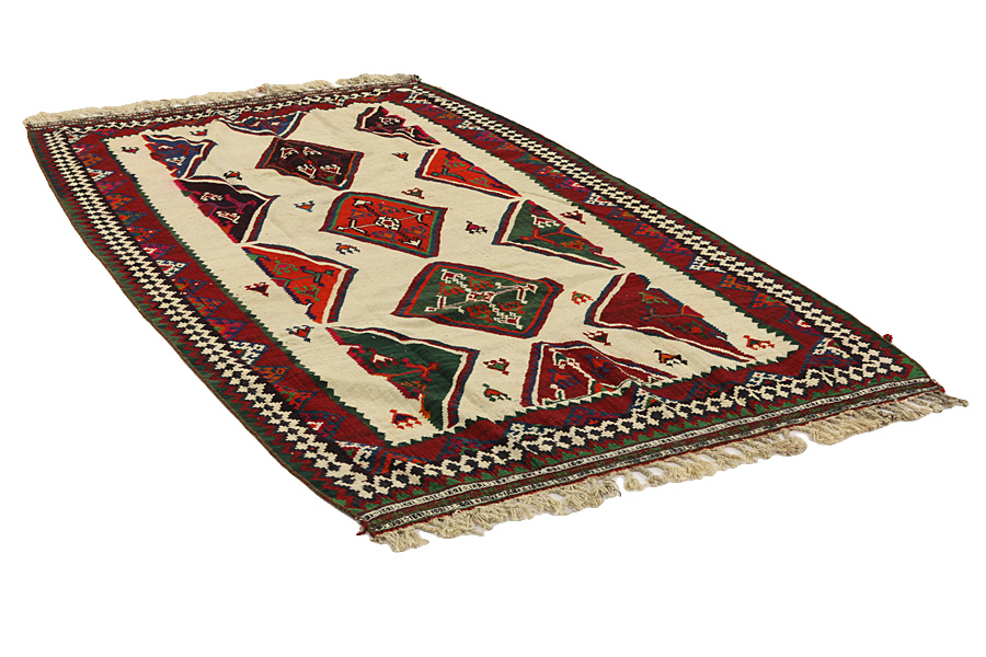Tapis Kilim: C’est un type prècis du tapis-tissé sans velours (qui est le type précédent de celui avec le velours) et ils sont fabriqués surtout par des nomades en Perse, en Afghanistan, en Turquie et à des régions différentes de Caucasse. Il s’agit des tissés pas de grandes dimensions avec un tissage simple, sans velours. Ils ont comme des caractèristiques des figures géometriques et des associations des couleurs très riches. Des matières naturelles comme la laine sont utilisés pour le tissage et quelquefois aussi la soie pour les kilims plus legers et plus fins. Le chromatisme du fil est fait par des plantes et des métaux qui donnent de beaux nuances naturels. La tradition séculaire des kilims se perd aux siècles aux nomades d’Asie centrale. D’abord, les kilims étaient surtout des articles d’utilisation domestique et plus tard sont devenus des produits commercialisables en suivant les meilleurs techniques de la tapisserie d’ est pendant le 16ième et le 17ième siècle. Ils ont aussi plusieurs utilisations et ils peuvent être utilisés au plancher comme des couvertures ou pour décoration aux murs. Le nom Kilim vient du mot persan gelim. Ils s’appellent Berr en kurde. Les plus fameux kilims persans sont les kilims Sumakh, Senneh, Fars et Ghashghai. Des kilims afghans sont les kilims Golbariasta, Maimane, Taimani, Maliki e.t.c Plusiers kilims sont tissés aussi aux frontières entre la Perse et l’Afghanistan par des nomades de Balouch avec les couleurs foncées de Terre.