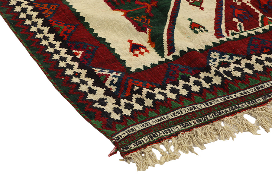 Tissé à l’un ou à tous les deux côtés du largeur du tapis: À quelques tapis les nomades à une côté tissent des franges à un kilim étroit qu’ils les tissent des petites tresses. C’est la technique des tisseurs différents pour reussir une meilleure résistance ou pour montrer leur habilété. Exemples