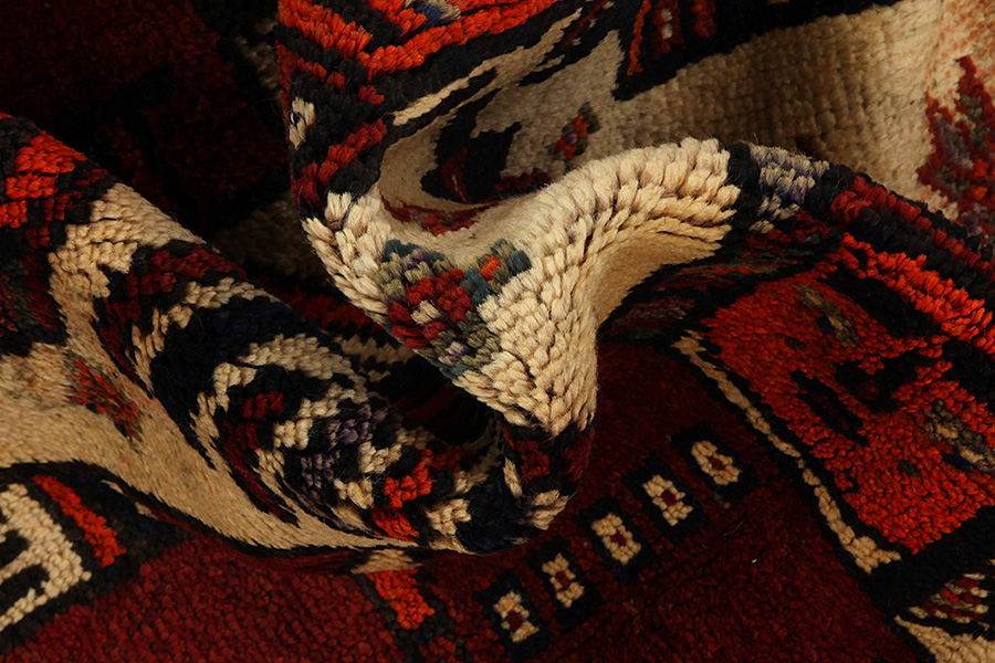 Tapis Qashqai: Les tapis Qashqai sont tissés par des nomades qui vivent à des régions montegnardes de Perse aux provinces de Fars, Kuzestan, au sud d’Isfahan et autour de la région de la ville Shiraz. Les tapis ont une grande densité en nœuds et une grande variété de dessins et en utilisant surtout le rouge profond et le bleu. Ils tissent des tapis, des kilims et des tissus décoratifs (des rubans, des sacs e.t.c) dans lesquels ils répresentent des instantanés de leur vie avec des représentations des hommes des animaux, des arbres et des fleurs. Aussi ils representent des images par des monuments historiques, surtout de Persepolis. Ils savent des dessins différents par cœur et ils tissent librement sans la contrainte sévère d’un dessin illustré.