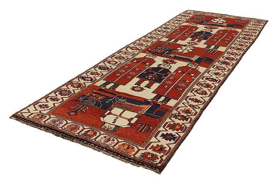 Tapis Qashqai: Les tapis Qashqai sont tissés par des nomades qui vivent à des régions montegnardes de Perse aux provinces de Fars, Kuzestan, au sud d’Isfahan et autour de la région de la ville Shiraz. Les tapis ont une grande densité en nœuds et une grande variété de dessins et en utilisant surtout le rouge profond et le bleu. Ils tissent des tapis, des kilims et des tissus décoratifs (des rubans, des sacs e.t.c) dans lesquels ils répresentent des instantanés de leur vie avec des représentations des hommes des animaux, des arbres et des fleurs. Aussi ils representent des images par des monuments historiques, surtout de Persepolis. Ils savent des dessins différents par cœur et ils tissent librement sans la contrainte sévère d’un dessin illustré.