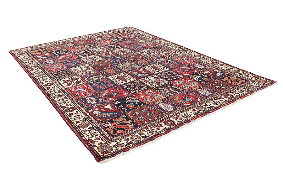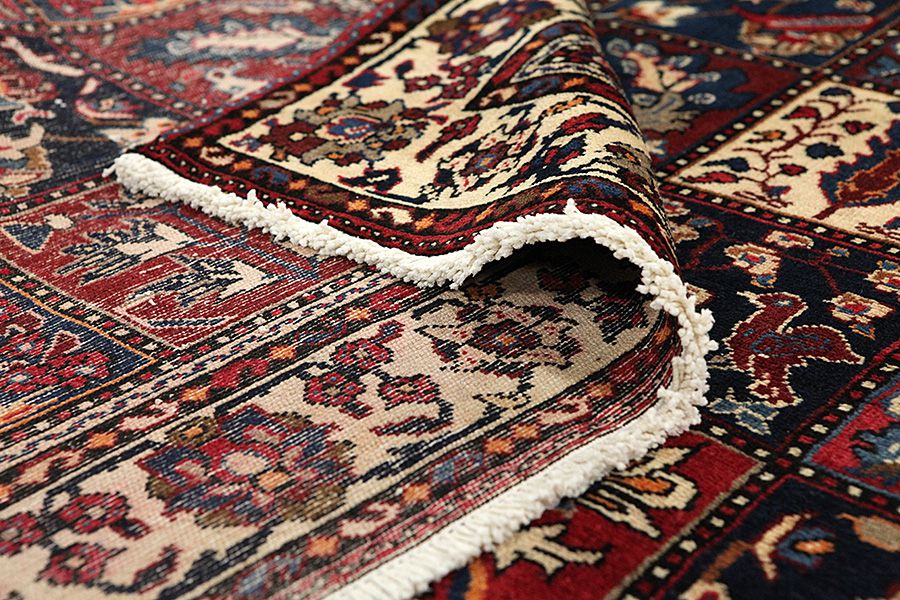 Tapis Bakhtiari: Les nomades Bakhtiar habitent dans les montagnes Zagros à l’ouest de la ville d’Isfahan autour de la ville de Shar-e-kurd. Leurs tapis sont connus pour leurs dessins de différents carrés répétitifs dans lesquels sont représentés des fleurs ou des animaux, d’où l’origine du nom de ce motif « jardin » (Khesti). Leurs tapis sont aussi très résistants avec un tissage en laine perse de très bonne qualité issue de moutons élevés en haute altitude. Les meilleurs tapis Bakhtiar avec la meilleure densité de nœuds sont les Bibibaff.