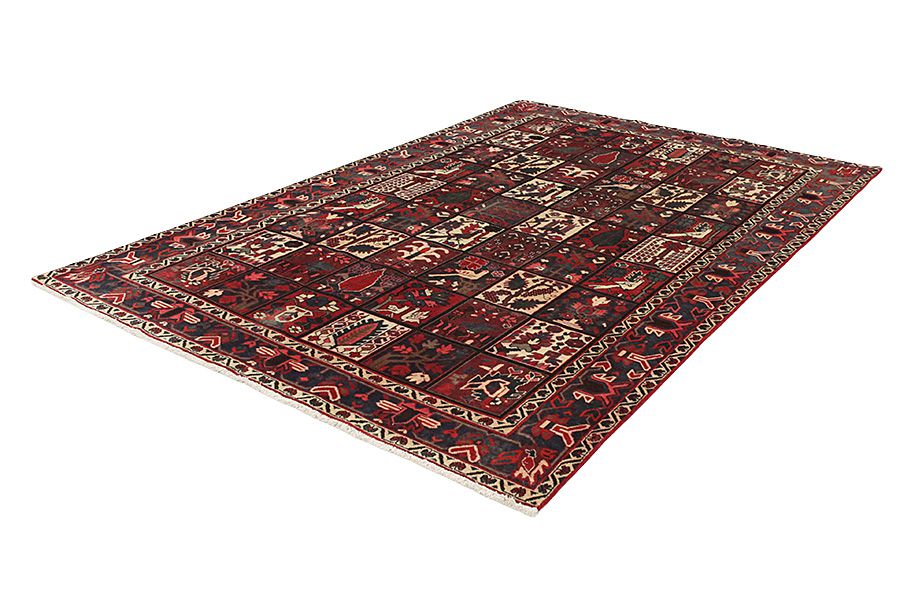 Tapis Bakhtiari: Les nomades Bakhtiar habitent dans les montagnes Zagros à l’ouest de la ville d’Isfahan autour de la ville de Shar-e-kurd. Leurs tapis sont connus pour leurs dessins de différents carrés répétitifs dans lesquels sont représentés des fleurs ou des animaux, d’où l’origine du nom de ce motif « jardin » (Khesti). Leurs tapis sont aussi très résistants avec un tissage en laine perse de très bonne qualité issue de moutons élevés en haute altitude. Les meilleurs tapis Bakhtiar avec la meilleure densité de nœuds sont les Bibibaff.