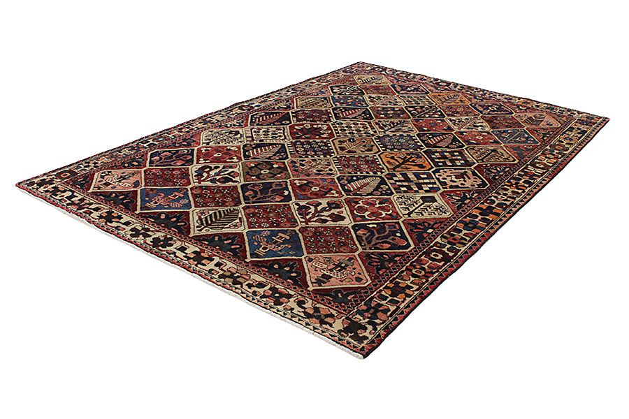 Tapis Bakhtiari: Les nomades Bakhtiar habitent dans les montagnes Zagros à l’ouest de la ville d’Isfahan autour de la ville de Shar-e-kurd. Leurs tapis sont connus pour leurs dessins de différents carrés répétitifs dans lesquels sont représentés des fleurs ou des animaux, d’où l’origine du nom de ce motif « jardin » (Khesti). Leurs tapis sont aussi très résistants avec un tissage en laine perse de très bonne qualité issue de moutons élevés en haute altitude. Les meilleurs tapis Bakhtiar avec la meilleure densité de nœuds sont les Bibibaff.