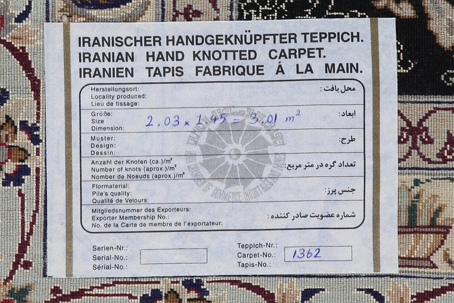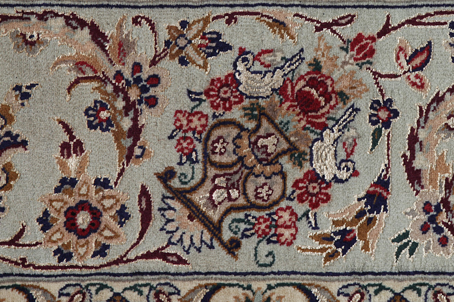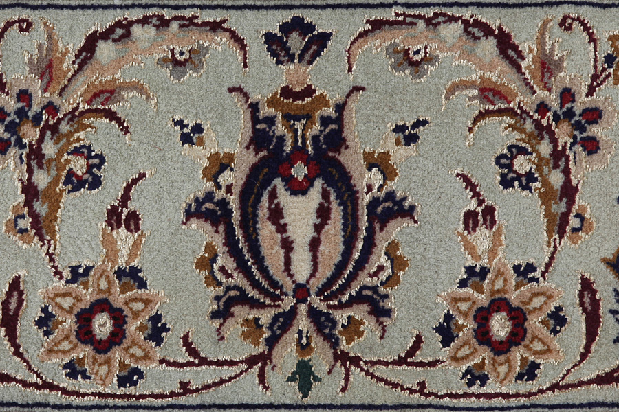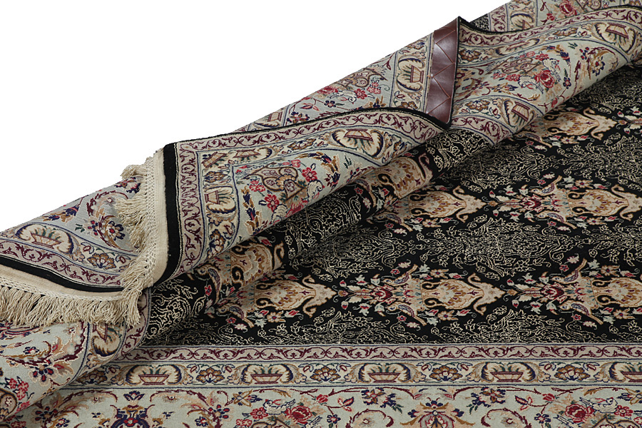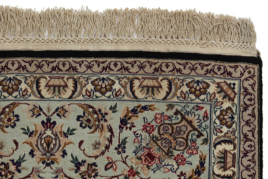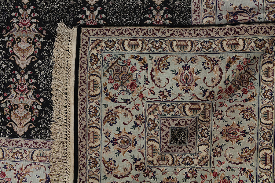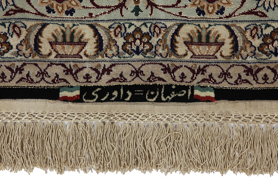 Tapis Ispahan: Au centre d’Iran entre les monts Zagros et le desert se trouve la ville d’Isfahan. Aujourd’hui c’est une ville très importante ville industrielle avec de 1,2 millions d’habitants. Au niveau architectural, la ville est un chef d’œuvre. La grande place Imam avec deux mosquées (Lotfollah et Ali Qapo) avec des palais, des parcs et des ponts vieux est entourée par des magasins avec des miniatures, des tapis, des bijouteries, des maisons de thé, qui créent l’ambiance d’Orient réel. Le grand bazaar s’étend de la partie nord de la place à une longueur de 5 km vers la mosquée Jame. Un proverbe ancien persan de 16ième siècle dit que Isfahan est le demi du monde. La ville Isfahan pendant la dynastie des Sarafides (1502-1629) était la capitale d’Iran ou le schah Abas avez rassemblé les meilleurs artisans des tapis noués à la main. Pendant cette periode là, les plus luxueux tapis ont été tissés. Ces tapis se trouvent à notre époque à des palais à des musées ou à la propriété des collecteurs connus à l’oposition de nouveau tapis n’avaient pas un médaillon centrale. Toute la surface du tapis est pleine de fleurs hélicoïdans artistiques et des flérons. Les plus nouveaux tapis Isfahan ne peuvent pas être comparés avec des vieux modèles exceptionnels qui étaient fabriqués exclusivement pour les bourgeois. En continuant la tradition, les tapis modernes d’Isfahan sont très fins à leur tissage et ils sont tondrus très bas pour relever mieux leur dessin. Ils utilisent aussi à leur tissage de la soie pour relever quelques parties du dessin surtout les fleurs. La chaîne est en soie ou en coton. Les dessins et le décor des tapis varient.