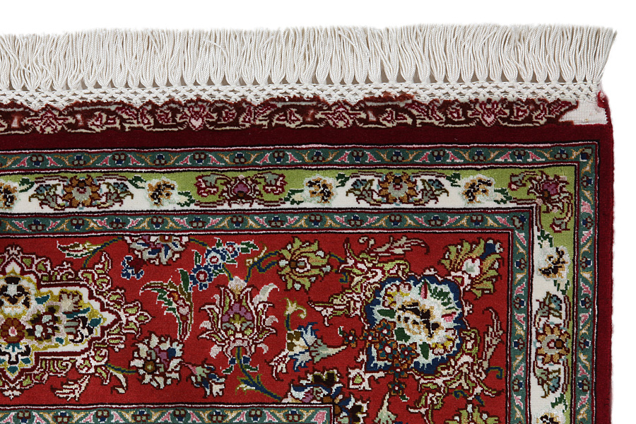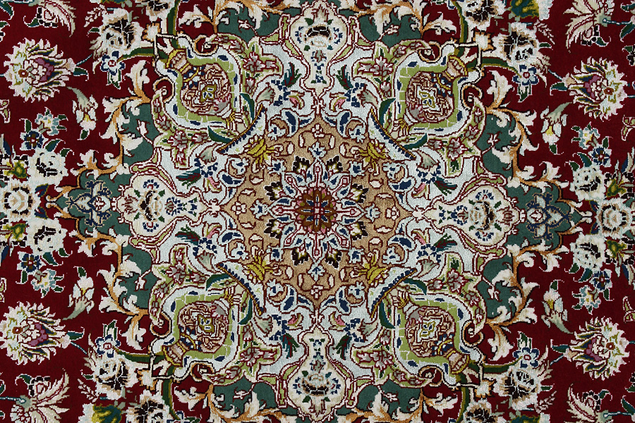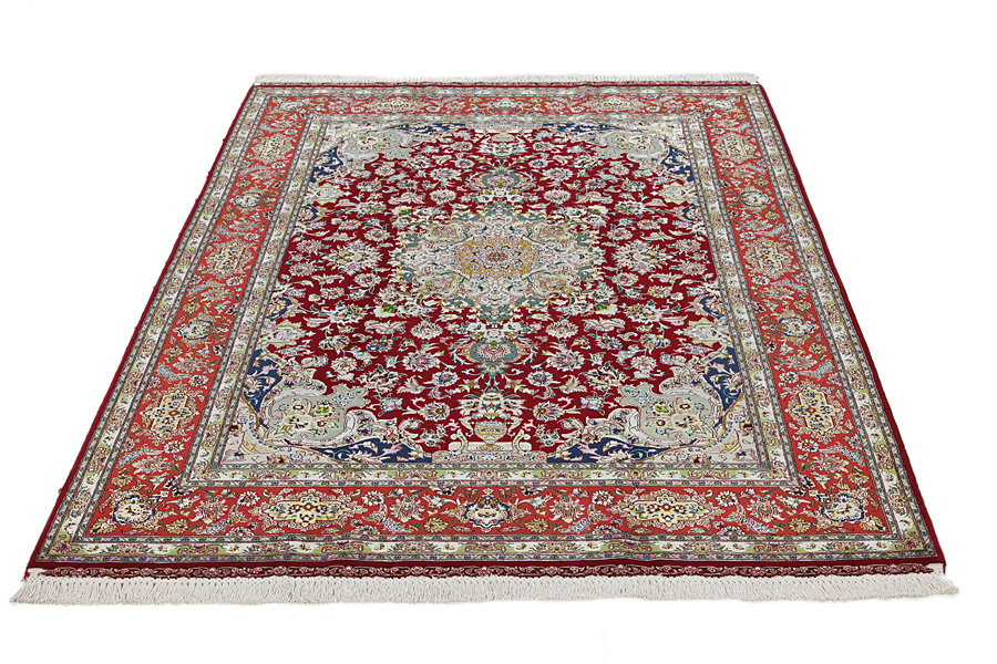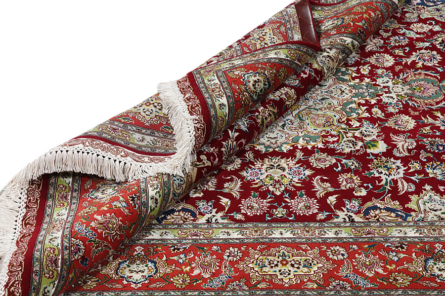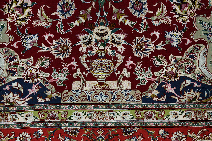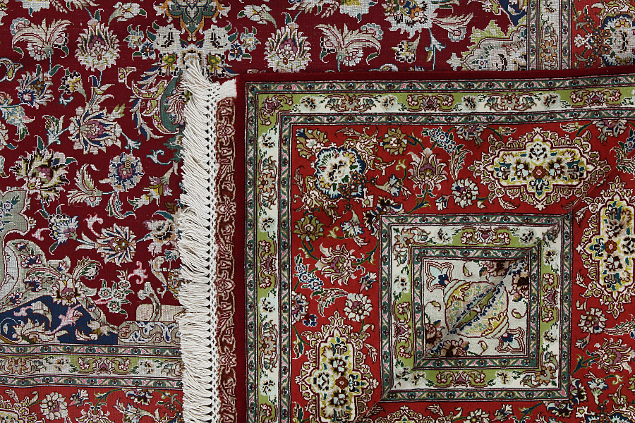 Tapis Tabriz: La ville Tabriz est la capitale de la province Azerbaïjan au sud-ouest d’Iran. Jusqu’à la fin de l’époque des caravanes Tabriz était le centre le plus important du commerce et du tissage des tapis. Par ici l’Ouest s’approvisionnait les chefs d’œuvres que des tisseurs renommés et capables tissent. Leurs qualités élevées ont fait les tapis connus aux marchés internationaux. Des atéliers des tapis noués à la main ont été crées où ils tissent de vieux et de nouveaux dessins avec une très grande densité en nœuds avec des matériaux de qualité excellente. La soie et la laine qualintative fine font les tapis de première classe. C’est la seule ville de Perse qui produit un si grand volume et et une si grande variété des tapis. Les tapis Tabriz sont impossants et ils ont leur style et leur originalité avec ou sans médaillon, avec des dessins pleins de l’imagination et de l’unicité des fleurs, des répresentations, des strophes, des poèmes à des couleurs comme le beige, le bleu et le rouge