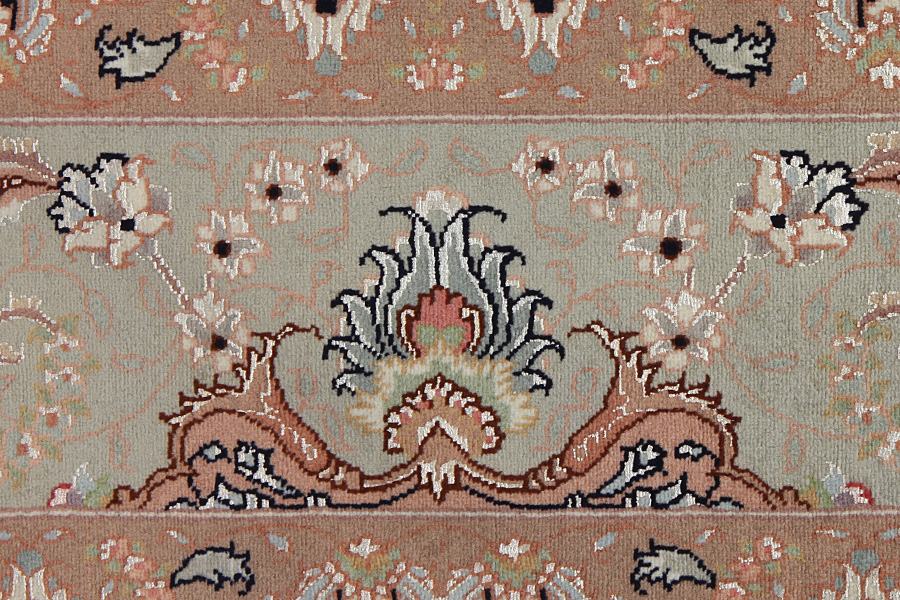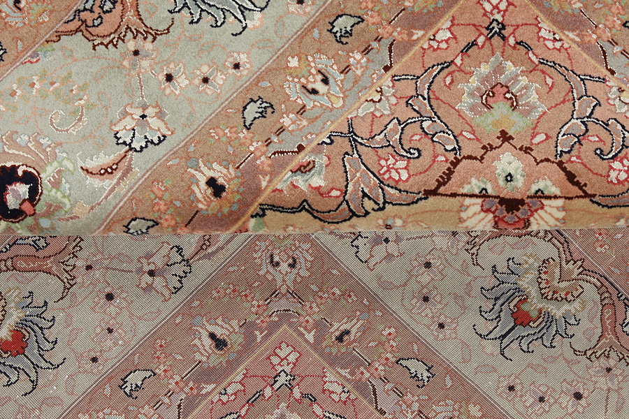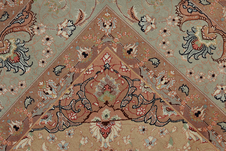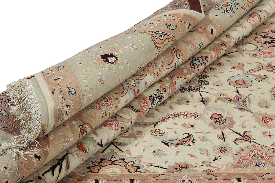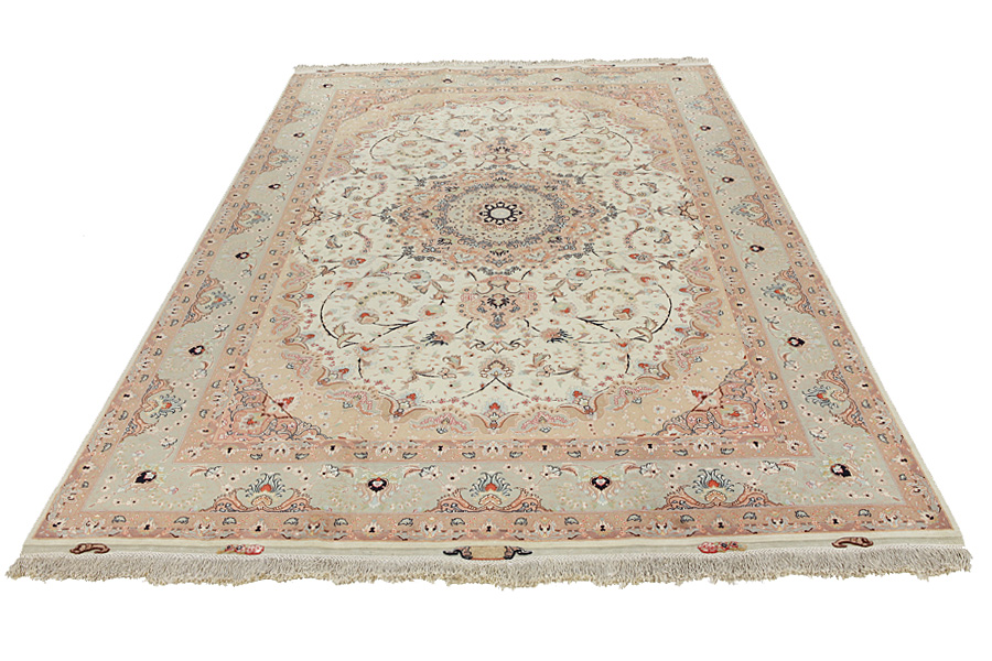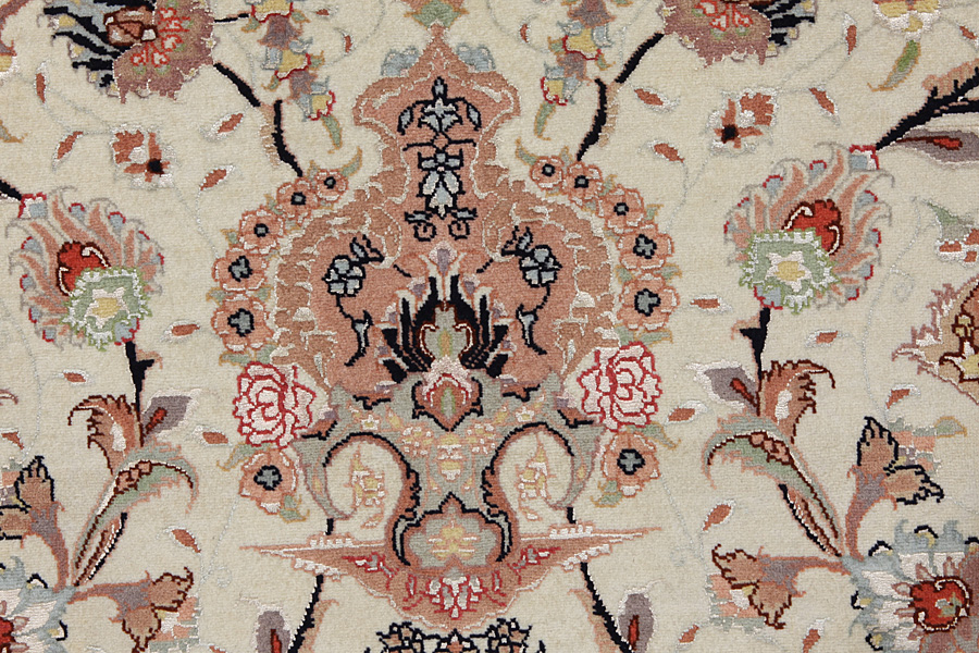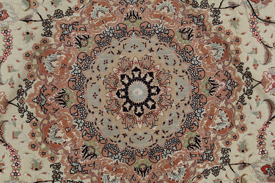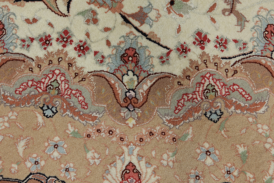 Tapis Tabriz: La ville Tabriz est la capitale de la province Azerbaïjan au sud-ouest d’Iran. Jusqu’à la fin de l’époque des caravanes Tabriz était le centre le plus important du commerce et du tissage des tapis. Par ici l’Ouest s’approvisionnait les chefs d’œuvres que des tisseurs renommés et capables tissent. Leurs qualités élevées ont fait les tapis connus aux marchés internationaux. Des atéliers des tapis noués à la main ont été crées où ils tissent de vieux et de nouveaux dessins avec une très grande densité en nœuds avec des matériaux de qualité excellente. La soie et la laine qualintative fine font les tapis de première classe. C’est la seule ville de Perse qui produit un si grand volume et et une si grande variété des tapis. Les tapis Tabriz sont impossants et ils ont leur style et leur originalité avec ou sans médaillon, avec des dessins pleins de l’imagination et de l’unicité des fleurs, des répresentations, des strophes, des poèmes à des couleurs comme le beige, le bleu et le rouge