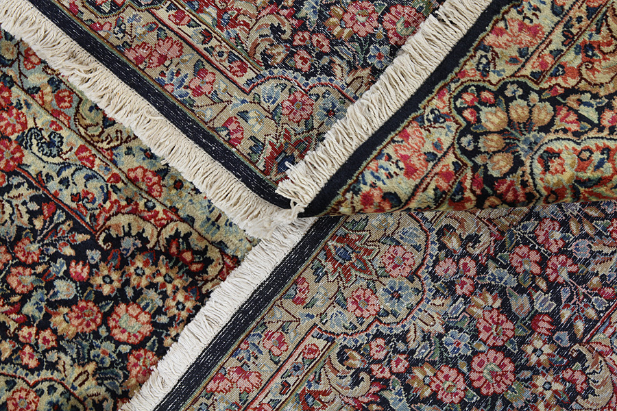 Tapis Kirman: Le tissage des tapis qui est une vieille tradition à Kerman est une de principales industries de la ville. Les tapis qui sont produits à la ville sont connus dans tout le monde. Le plus vieux tapis qui est trouvé à Kerman date avant 500 années, évenement qui prouve la superiorité des tapis qui sont tissus ici. Aussi des écharpes et des tissus fins et d’autres produits textiles de laine ou de coton sont fabriqués comme au passé. Quand en 1271 Marko Polo a visité la ville Kerman, elle est devenue un centre commercial et a lié le golf Persique avec Khorasan et l’Asie centrale. Pendant la dynastie de Sarafides, des tapis sont exportés en Angleterre et en Allemagne. Le succès des tapis Kerman est dû à l’événement que les tisseurs ont crée des dessins plus riches en ayant comme modèle, les tapis –aubusson. Leurs caractèristiques sont les couleurs brillantes et la multitude des fleurs avec des guirlantes et des médaillons. Les laines à la région Kerman sont des laines de grande qualité en graisse qui les font très brillants.