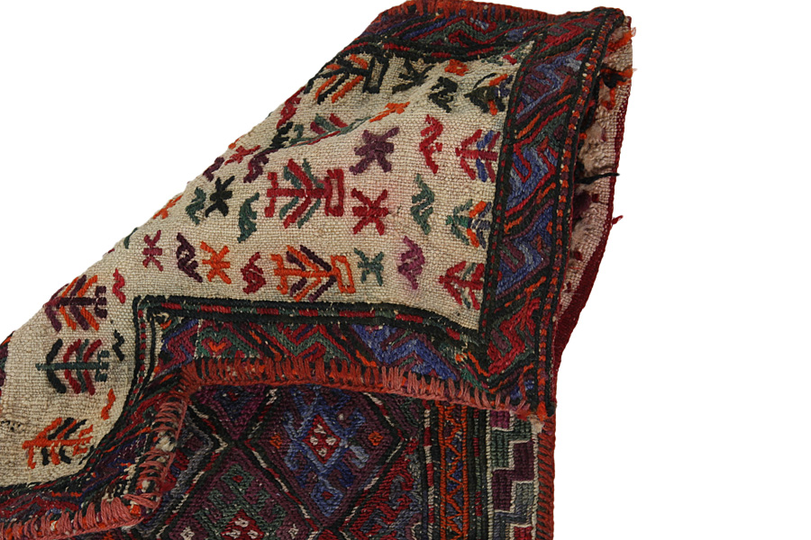 Tapis Saddle Bag: ​​Les sacs pour selle à cheval sont faits par les Nomades pour les utiliser eux-mêmes. Il existe 2 types de sacs :les sacs pour selle-kilim et des sacs pour selle noués. Le coté avant d’un sac est soit noué avec des nœuds (comme un tapis) soit utilise des techniques différentes. Le côté derrière est souvent noué alors que pour le centre du sac des techniques différentes (comme par exemple la technique Soumak) sont appliquées. Les couleurs avec lesquelles les sacs sont teints sont toutes naturelles et faites par les Nomades eux-mêmes. Les voyageurs utilisaient ces sacs pour transporter des denrées quotidiennes à cheval ou à dos d' âne. Il s'agit d'une pièce d’art exceptionnelle qui peut apporter une ambiance orientale unique chez-vous. Ces sacs peuvent être utilisés comme coussins d'assise, comme poufs au sol (par exemple près de la cheminée) ou pour décorer vos murs. De plus ces petits sacs pour selle de cheval peuvent être utilisés pour stocker vos journaux ou vos magazines.
