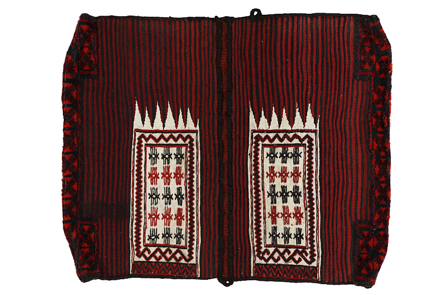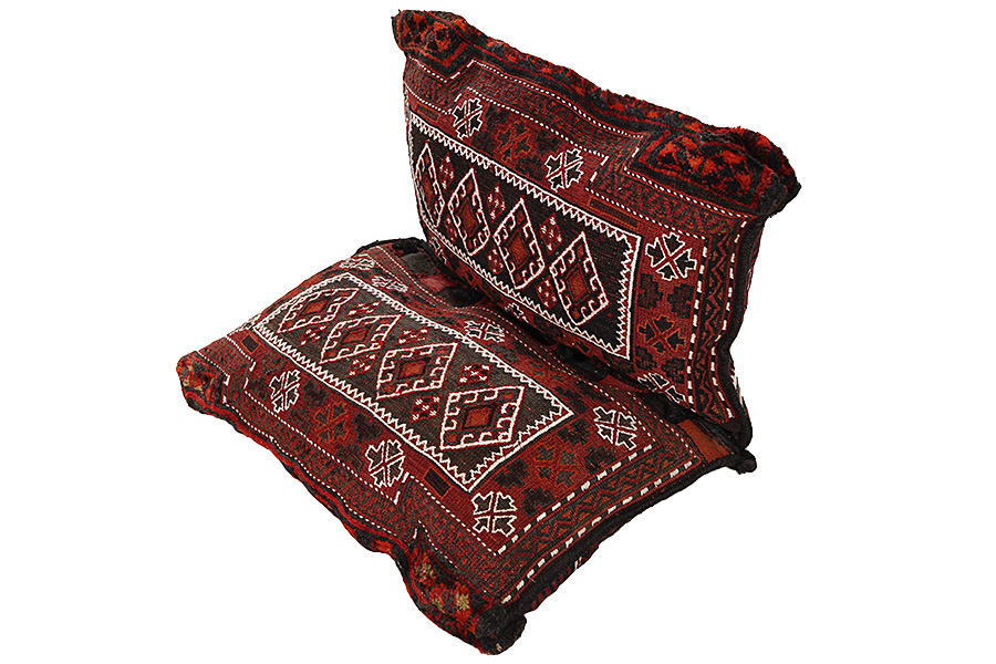 Tapis Saddle Bag: ​​Les sacs pour selle à cheval sont faits par les Nomades pour les utiliser eux-mêmes. Il existe 2 types de sacs :les sacs pour selle-kilim et des sacs pour selle noués. Le coté avant d’un sac est soit noué avec des nœuds (comme un tapis) soit utilise des techniques différentes. Le côté derrière est souvent noué alors que pour le centre du sac des techniques différentes (comme par exemple la technique Soumak) sont appliquées. Les couleurs avec lesquelles les sacs sont teints sont toutes naturelles et faites par les Nomades eux-mêmes. Les voyageurs utilisaient ces sacs pour transporter des denrées quotidiennes à cheval ou à dos d' âne. Il s'agit d'une pièce d’art exceptionnelle qui peut apporter une ambiance orientale unique chez-vous. Ces sacs peuvent être utilisés comme coussins d'assise, comme poufs au sol (par exemple près de la cheminée) ou pour décorer vos murs. De plus ces petits sacs pour selle de cheval peuvent être utilisés pour stocker vos journaux ou vos magazines.