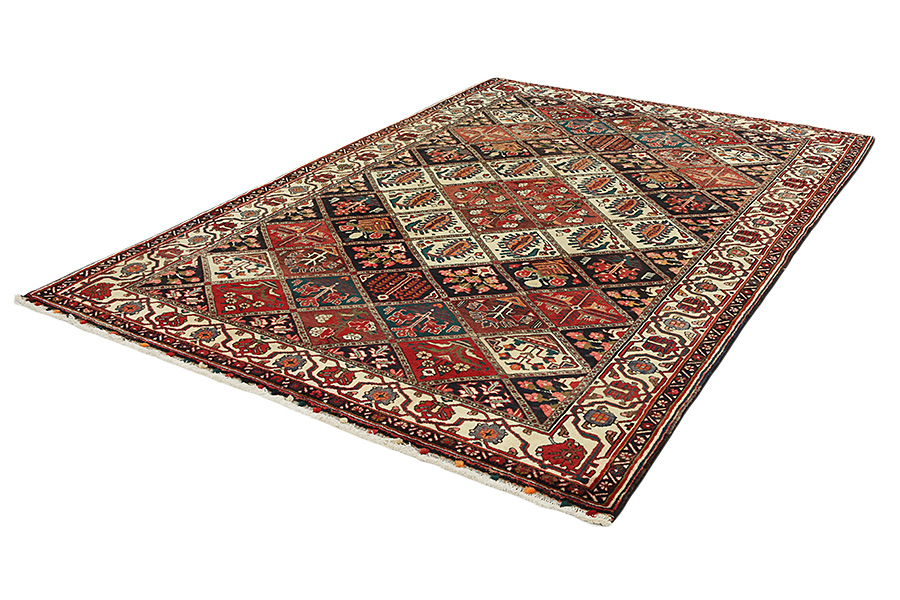 Tapis Bakhtiari: Les nomades Bakhtiar habitent dans les montagnes Zagros à l’ouest de la ville d’Isfahan autour de la ville de Shar-e-kurd. Leurs tapis sont connus pour leurs dessins de différents carrés répétitifs dans lesquels sont représentés des fleurs ou des animaux, d’où l’origine du nom de ce motif « jardin » (Khesti). Leurs tapis sont aussi très résistants avec un tissage en laine perse de très bonne qualité issue de moutons élevés en haute altitude. Les meilleurs tapis Bakhtiar avec la meilleure densité de nœuds sont les Bibibaff.