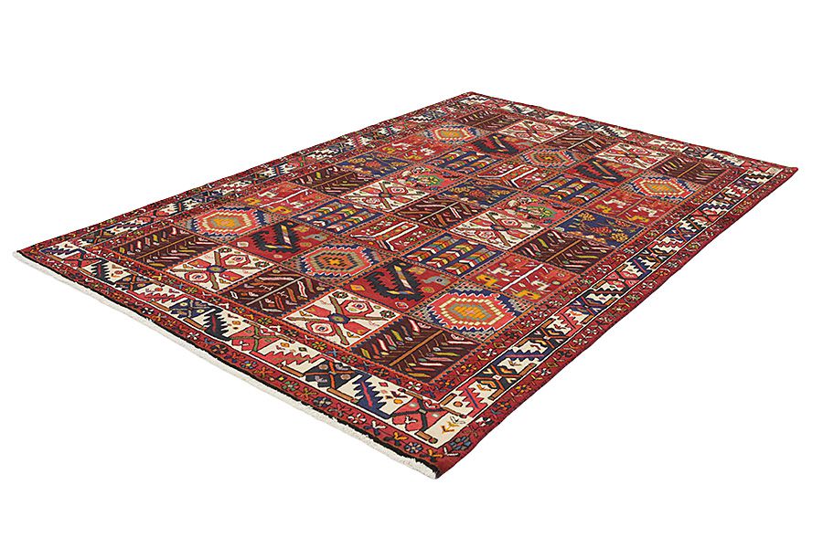 Tapis Bakhtiari: Les nomades Bakhtiar habitent dans les montagnes Zagros à l’ouest de la ville d’Isfahan autour de la ville de Shar-e-kurd. Leurs tapis sont connus pour leurs dessins de différents carrés répétitifs dans lesquels sont représentés des fleurs ou des animaux, d’où l’origine du nom de ce motif « jardin » (Khesti). Leurs tapis sont aussi très résistants avec un tissage en laine perse de très bonne qualité issue de moutons élevés en haute altitude. Les meilleurs tapis Bakhtiar avec la meilleure densité de nœuds sont les Bibibaff.